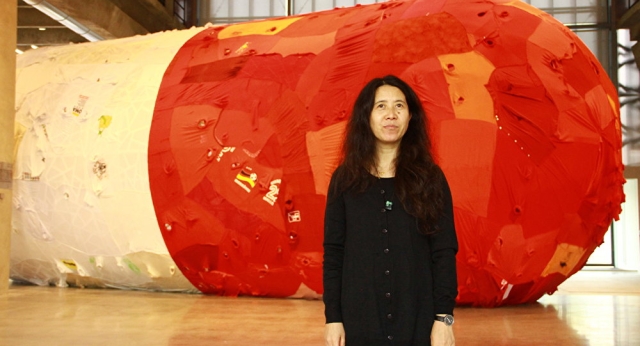 尹秀珍在莫斯科展出的艺术项目被称为缓释胶囊(Slow Release) 。艺术家对技术和全球化社会的加速度发展进行了思考,她试图通过自己创作的作品令生活过程放缓。她说, 我在当地收集了一些旧衣服,它是我用莫斯科人穿过的一些衣服来制作的。因为它是穿过的,所以我觉得它不是很轻的一个东西,它是含有历史的,含有俄罗斯人的生活背景,然后在重新缝制在一起之后,形成了一个新的社会。所以有些部分可能它们是从不相识的,但在这里它们重新组合在一起,所以又有一种新的关系在里面,比如新的竞争啊。所以我觉得把这些东西缝合在一起,但它同时又是胶囊的形状,是一种药物,所以它对人有一种治愈。因为人一进入到药丸,缓释胶囊由很多小颗粒药丸组成,展览时人们都进去了,那么他们会对社会产生什么作用。药物在底下运行,但是是由人来改变这个世界,但你怎么去改变世界,我觉得非常重要。