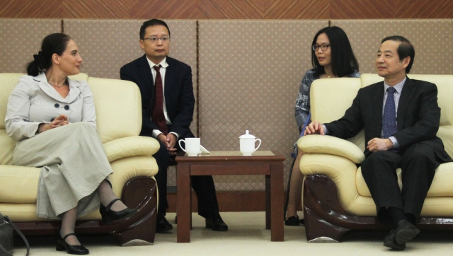 开幕式前,曹德明在图文中心贵宾厅会见了匈牙利来宾一行,并与朱迪·哈默施泰因就两国教育合作等问题进行了深入交流,曹德明介绍了上外的办学历史、学科特色及国际交流情况,他指出,随着“一带一路”建设的推进,上外将针对沿线国家开设相关的语言专业,加强相关的区域国别研究。