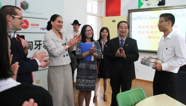 开幕式后,校领导陪同匈牙利客人参观了上外匈牙利语教室,并举行了匈牙利总领事馆向上外匈牙利语专业赠书仪式。匈牙利语教室在匈牙利总领事馆提供的方案下设计完成,具有鲜明的匈牙利民族风格,软、硬件设施配备齐全。