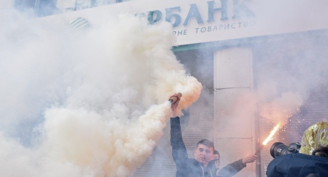 激进分子13日在俄罗斯储蓄银行基辅子行的办事处门前放置了混凝土预制件。庭院入口也被沙袋封锁,在银行大楼粉刷了反俄口号。以此想逼迫储蓄银行在乌克兰停止工作。