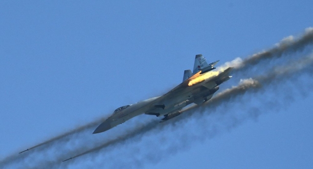 俄苏-27歼击机在美国轰炸机远离俄边界后顺利返回己方驻扎机场。